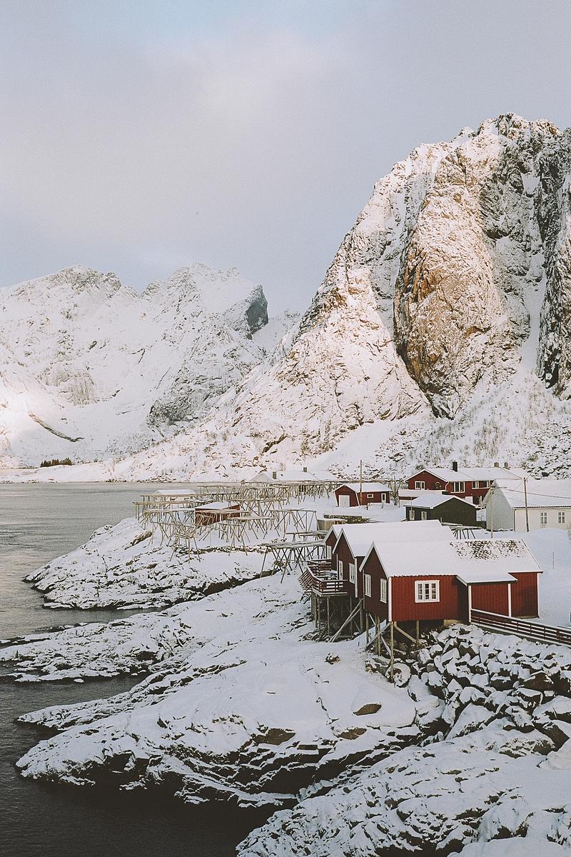 Winter sunrise in the Lofoten Island village of Hamnøy. Shot on 35mm Kodak Portra 400 film.